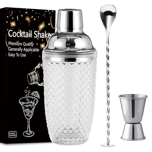 Chingcoo Cocktail Shaker 400ml Glas Cocktailshaker Klarglas Silber Cocktail Shaker Mixer Set Schaufel Anfänger Barkeeper Kit mit Edelstahl Messbecher Schaufel für Zuhause Bar Fruchtsäfte Getränke