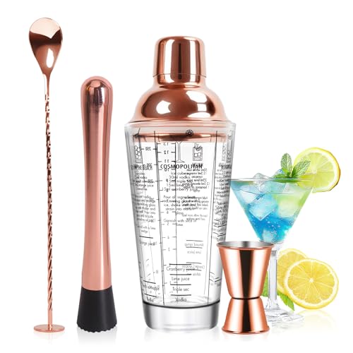 SAVORLIVING 14oz Cocktail-Shaker-Set aus Glas, 4-teiliges Barkeeper-Set, Martini-Mixer-Shaker mit integriertem Sieb, Rührlöffel, Messbecher und Stößel, Bar-Werkzeugset für Anfänger (Roségold)